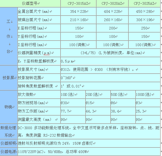 CPJ-3000A系列数字式测量投影仪整机品质优良,性能稳定。仪器配有脚踏开关和多功能数据处理表DC-300,数据输出和采样十分方便,使测量更快捷,效率更高。CPJ-3000C仪器配有物镜旋转盘,可同时配备三个物镜,在不同放大倍率工作时,只须旋转转盘即可,不需要在单独更换物镜,操作更加方便简单,仪器调焦由投筒升降实现,行程大,稳定性好;工作台不升降,增强了稳定性,测量范围的啊,精度高。